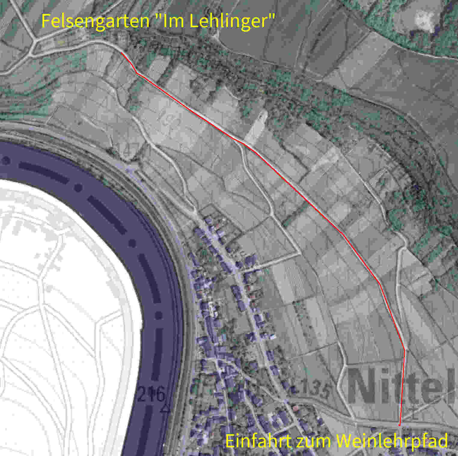 Der Felsengarten "Im Lehlinger" liegt direkt am Nitteler Fels, dem schon von weither sichtbaren Wahrzeichen von Nittel, unmittelbar am Moselsteig und ist mit dem Auto erreichbar (auch wenn die Straße eigentlich nur für den landwirtschaftlichen Verkehr zugelassen ist). Die Einfahrt ist in Nittel gegenüber dem Ende der Straße "Im Blümchen" an der Landesstraße L135, die in Richtung Onsdorf führt. Die Koordinaten sind: 49.663028, 6.438790 / 49°39'46.9"N 6°26'19.6"E. Wenn Sie sich auskennen, können Sie auch von der anderen Seite über Wellen kommen.